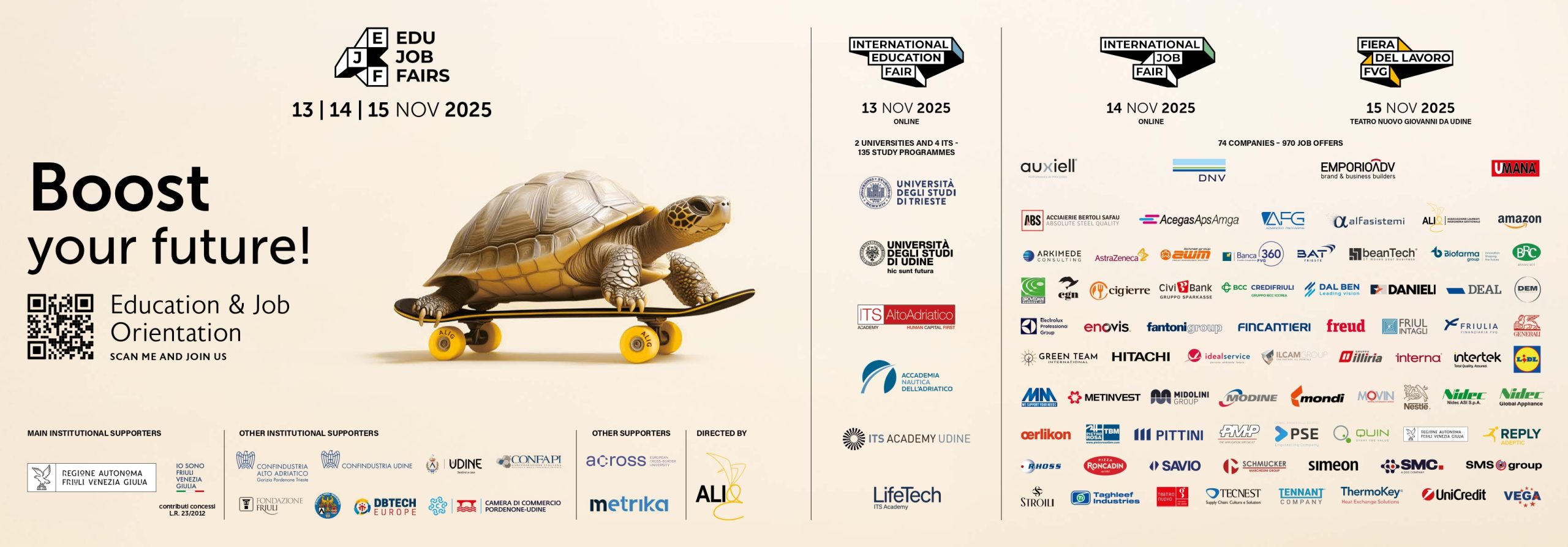 Edu Job Fairs coinvolge istituzioni, imprese, alta formazione, associazioni di categoria con l’obiettivo di aumentare l’attrattività del territorio regionale per studenti e lavoratori. Un traguardo ambizioso che guarda al futuro, verso una rinnovata competitività del Friuli Venezia Giulia nel panorama economico internazionale.